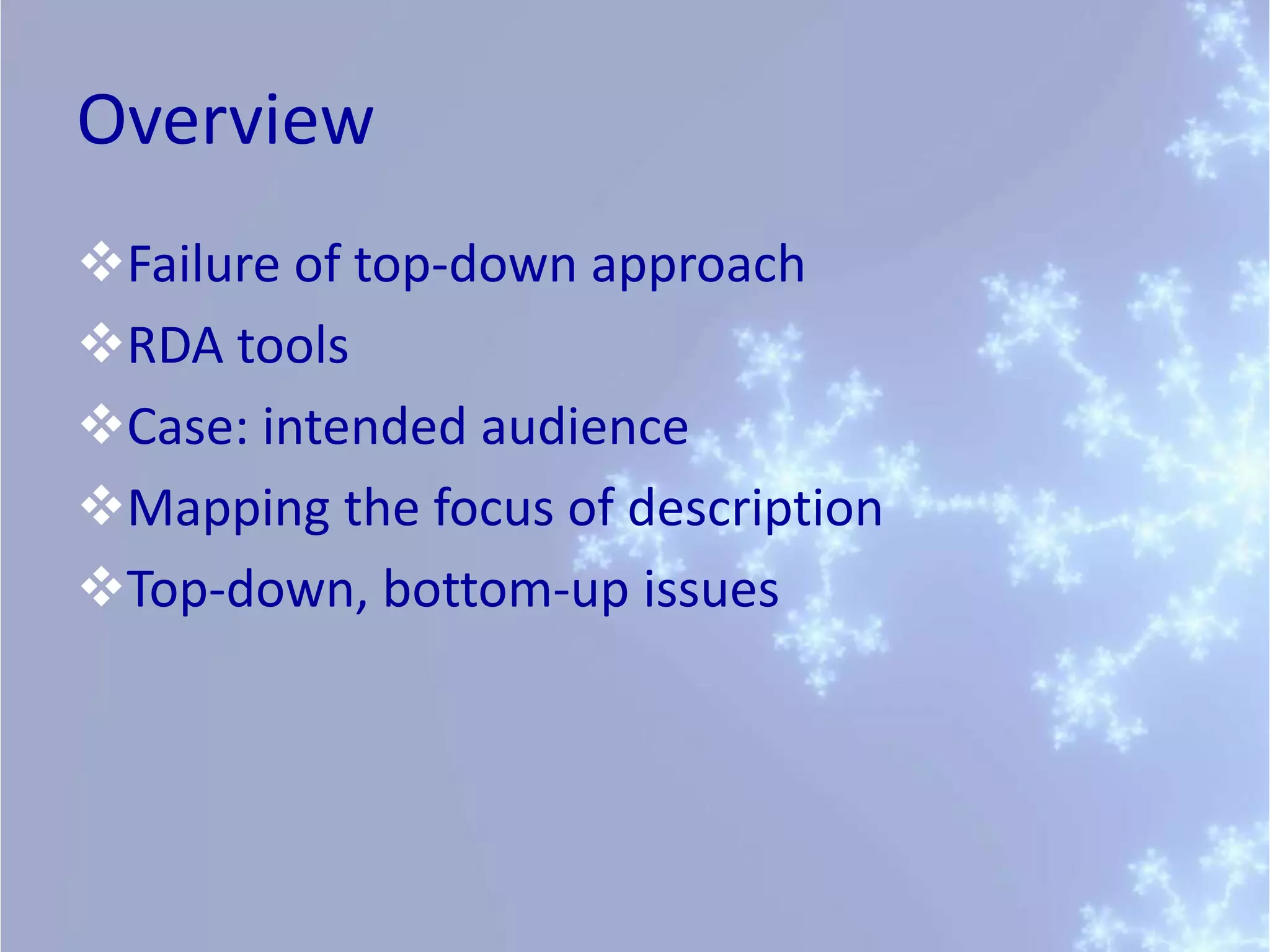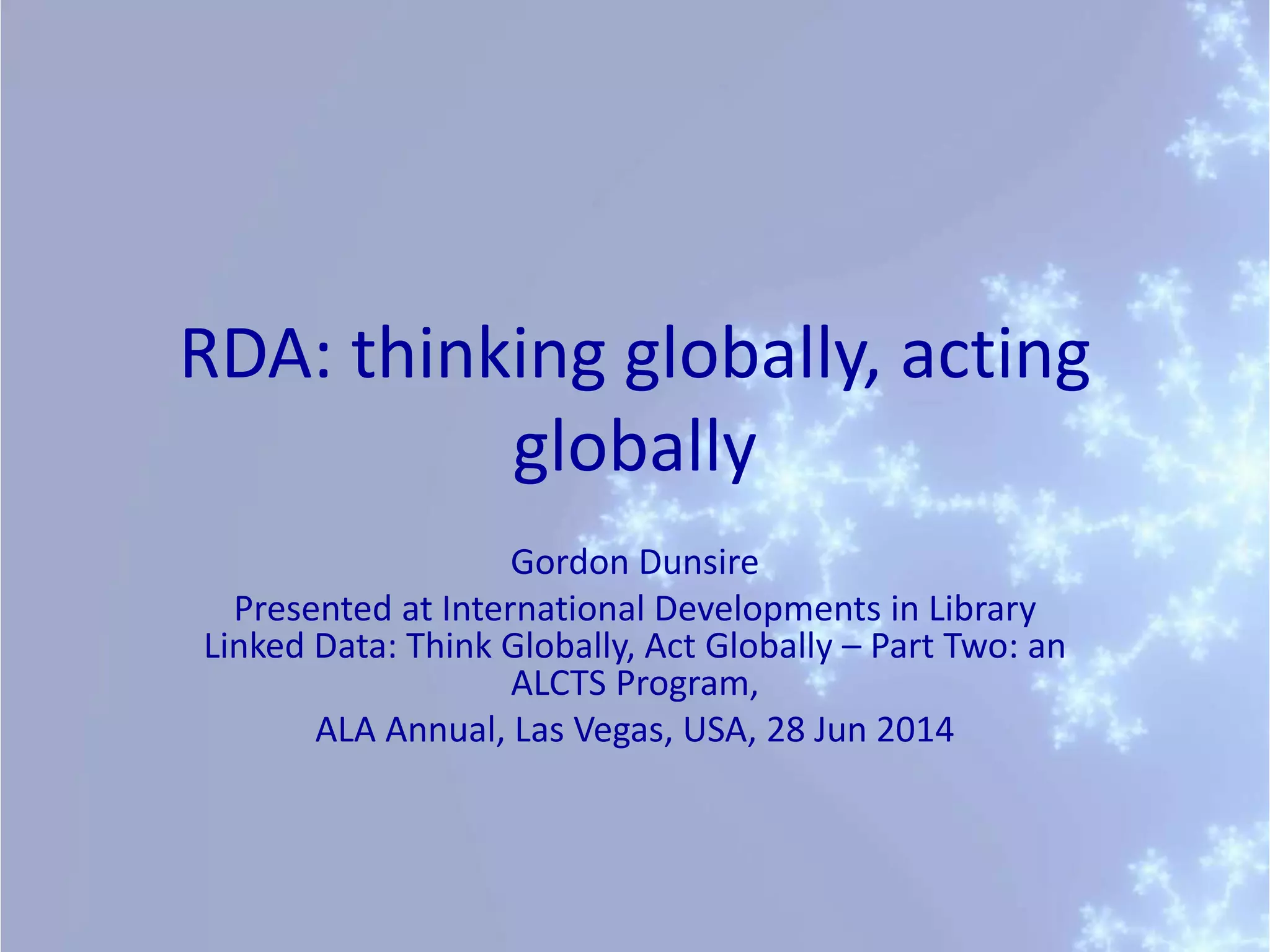 This document discusses approaches to developing globally interoperable metadata standards like RDA. It describes the failure of top-down approaches and issues with both top-down and bottom-up mapping strategies. Bottom-up risks multiple overlapping element sets while top-down may not fully represent local practices. The author advocates balancing global needs with flexibility for local implementation.