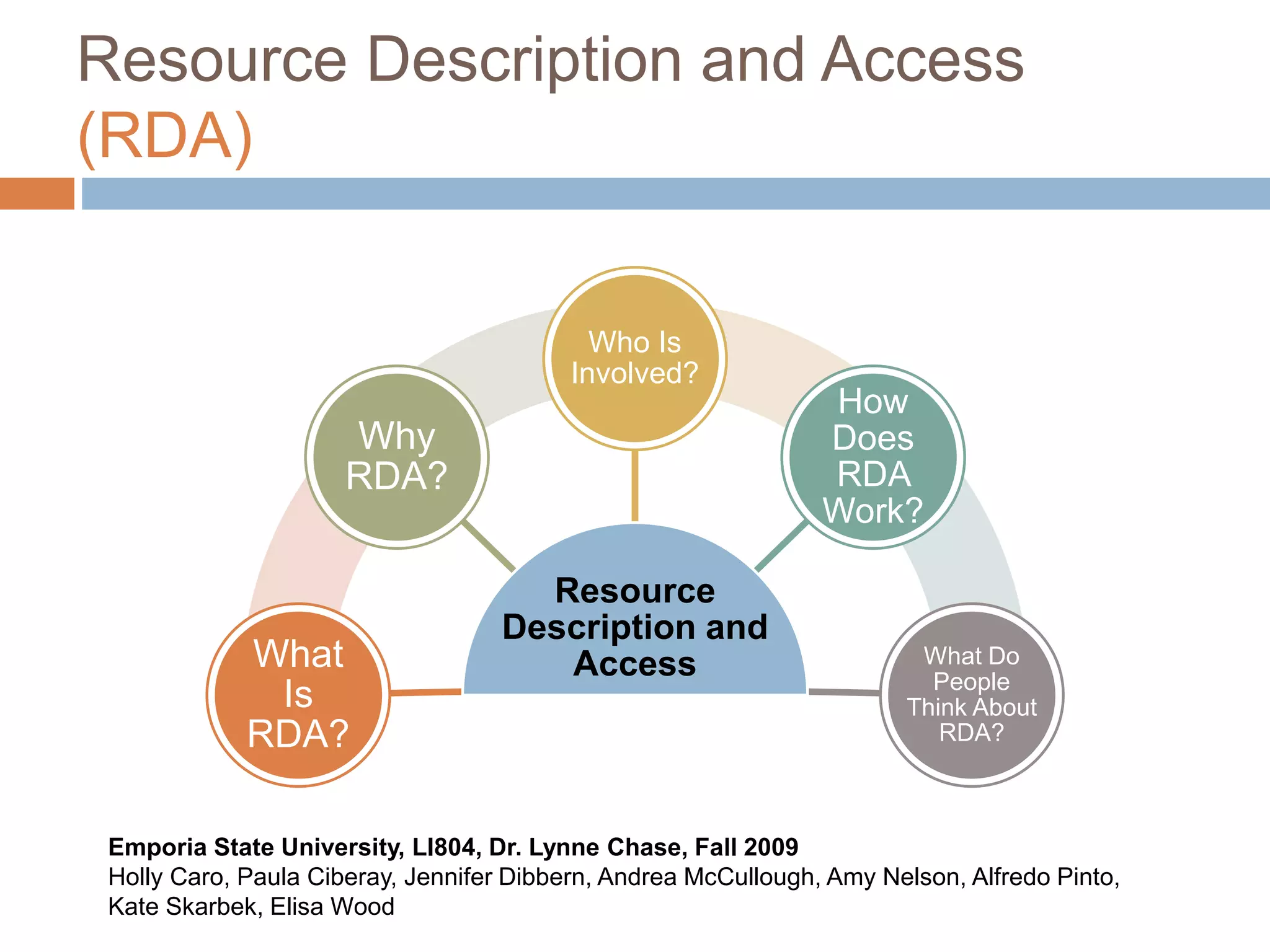 RDA is a new cataloging standard designed to replace AACR2 and provide guidelines for describing digital resources. It is based on FRBR and FRAD which are models that organize information by user tasks and relationships between entities like works, expressions, manifestations and items. RDA aims to be more intuitive for users by providing more detailed descriptions of resources and is being tested by various libraries and organizations before its full implementation. However, some questions remain regarding its costs and benefits compared to AACR2.