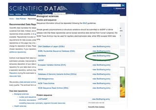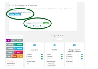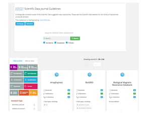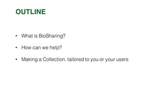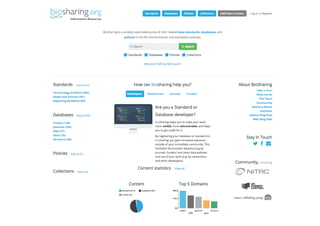 This document discusses the BioSharing registry, which connects standards, databases, and policies in the life sciences. BioSharing provides a searchable portal for standards and databases, helping researchers choose the right options for publishing and funding requirements. It monitors the development of standards and their adoption. The registry links three sections on standards, databases, and policies to help answer common questions about which options to use. Users can search, filter, and refine results or create customized collections. BioSharing aims to support better informed decisions across the life sciences research community.
