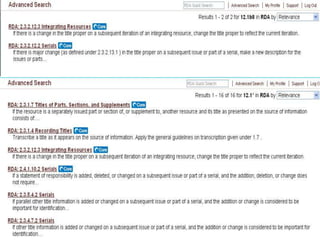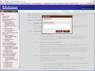 The document provides an overview of RDA Toolkit, which is an online product that allows users to interact with cataloging resources including RDA. It discusses what RDA is as a standard for bibliographic description based on FRBR concepts, and what the RDA Toolkit is as an integrated online product containing RDA, the RDA element set, AACR2, mappings, and user-created content. It also covers subscriptions, logging in, navigation, search functionality, and user-created content within the RDA Toolkit.