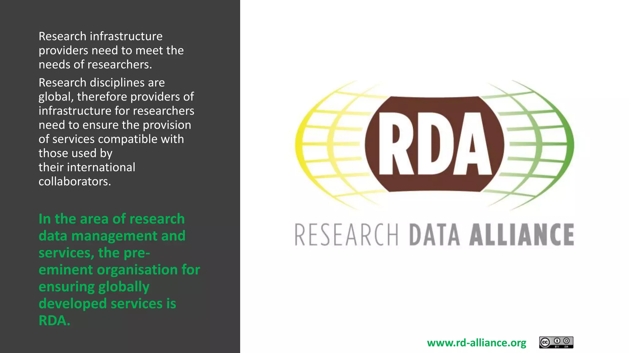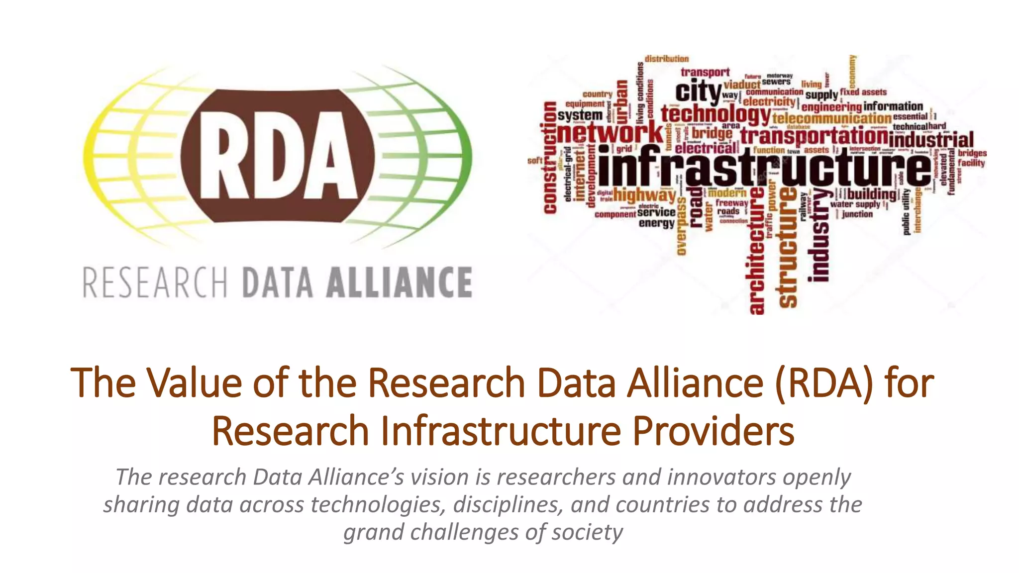 The document discusses the value of research infrastructure providers engaging with the Research Data Alliance (RDA). It outlines that RDA works to enable open sharing of research data globally across disciplines to address societal challenges. As research is global, infrastructure providers need globally compatible services, and RDA ensures this. The document provides reasons for providers to engage with RDA, such as access to an international network and opportunities to collaborate on data standards. It also describes ways providers can engage, such as joining RDA groups or attending meetings.