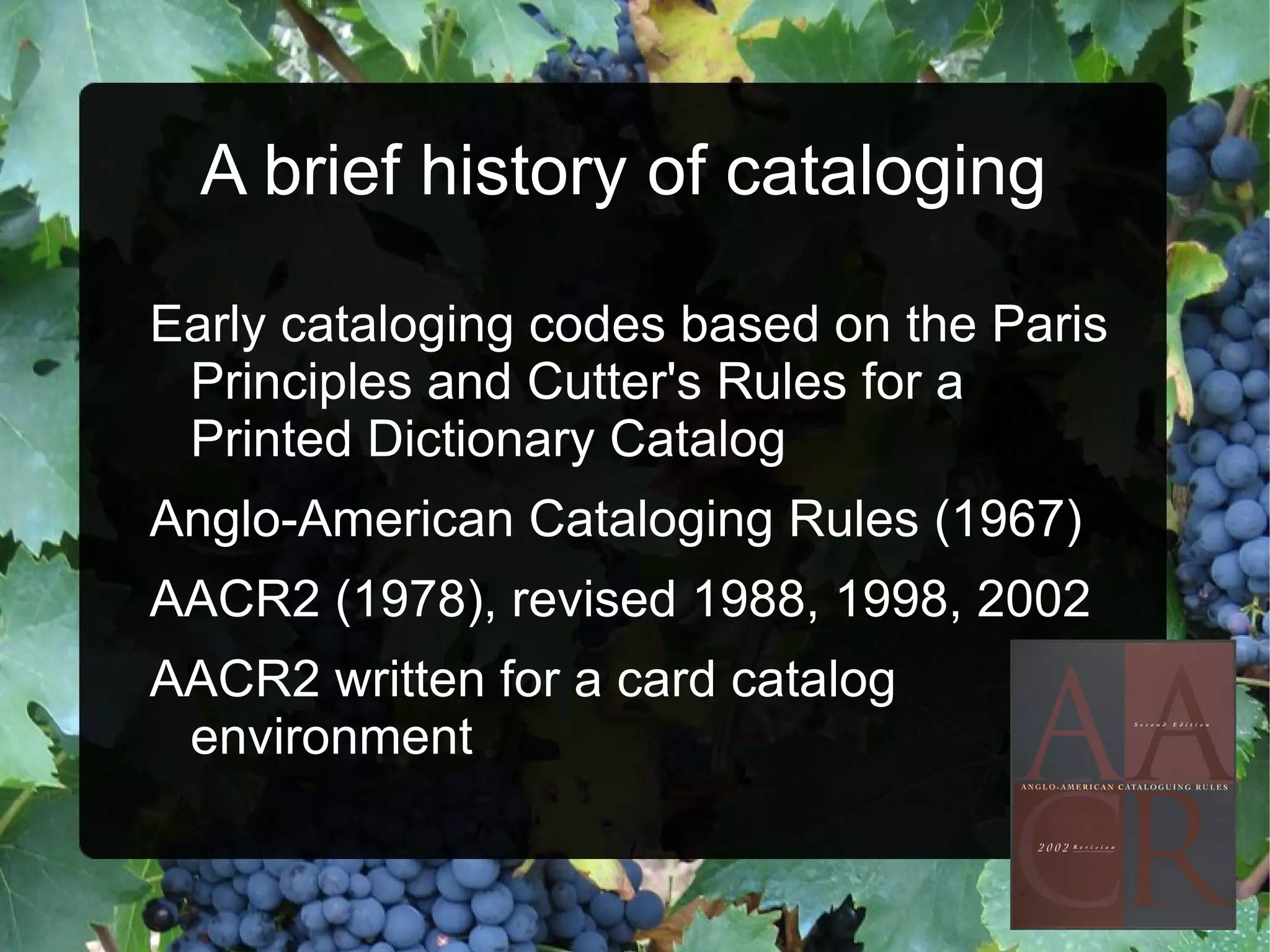 This document provides an overview of Resource Description and Access (RDA), including its history and development, testing process, implementation timeline, relationship to FRBR, and tools for accessing and learning RDA. It discusses how RDA is structured differently than AACR2 and will be coded in MARC, as well as references for further information.