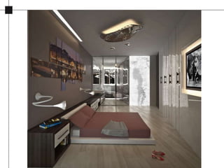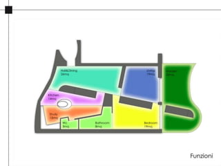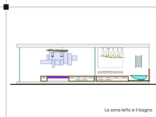 Il documento descrive una selezione di mobili e illuminazione, includendo design specifici come il divano Flap di Edra e la lampada Funnel di Vibia. Vengono menzionati anche altri pezzi tra cui il tavolo Campo d'Oro di De Padova e la sedia Fronzoni '64 di Cappellini. La scelta degli arredi è un tema centrale del testo.