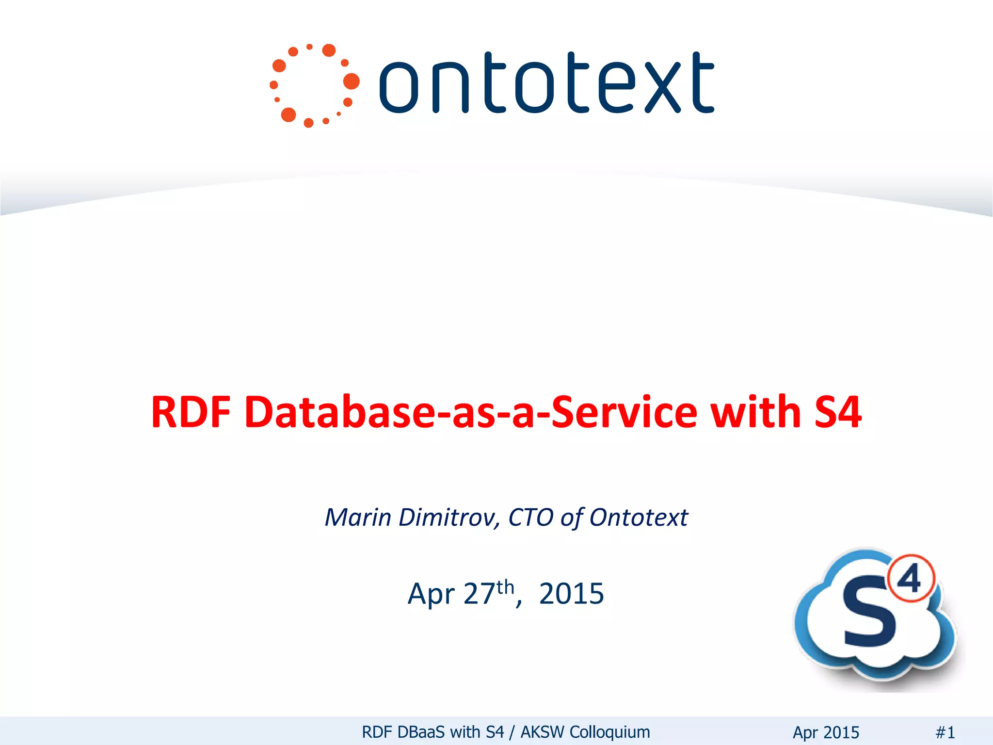 The document discusses the RDF Database-as-a-Service (DBaaS) provided by Ontotext, focusing on its Self-Service Semantic Suite (S4), which offers on-demand text analytics, content enrichment, and metadata management through a scalable cloud infrastructure. Key features include easy access to RDF graph databases, pay-per-use pricing, and no upfront commitments, making it suitable for various industries such as media, healthcare, and education. The service is designed for low administration, high availability, and includes support for multiple programming languages and additional research-focused offerings.
