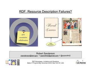 RDF has several advantages as a data modeling technique including its ability to represent complex relationships as graphs and enable novel inferences. However, graphs also introduce complexity in querying, storage, and visualization. Additional challenges include the open world assumption, managing ontologies and identities, multiple serialization formats, and addressing temporal issues as data changes over time. Overall, proponents argue that the benefits outweigh the limitations, which can be mitigated through tools and standards, and RDF enables a more powerful representation of data on the web compared to alternatives.