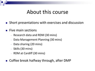 This document summarizes a training course on research data management for librarians. The course covers key topics like what research data is, data management planning, data sharing, skills needed to support research data management, and how libraries can play a role in supporting RDM at their institution. The training includes presentations, exercises, and discussions to help librarians understand research data issues and ways they can provide services to support researchers with managing and sharing their data.