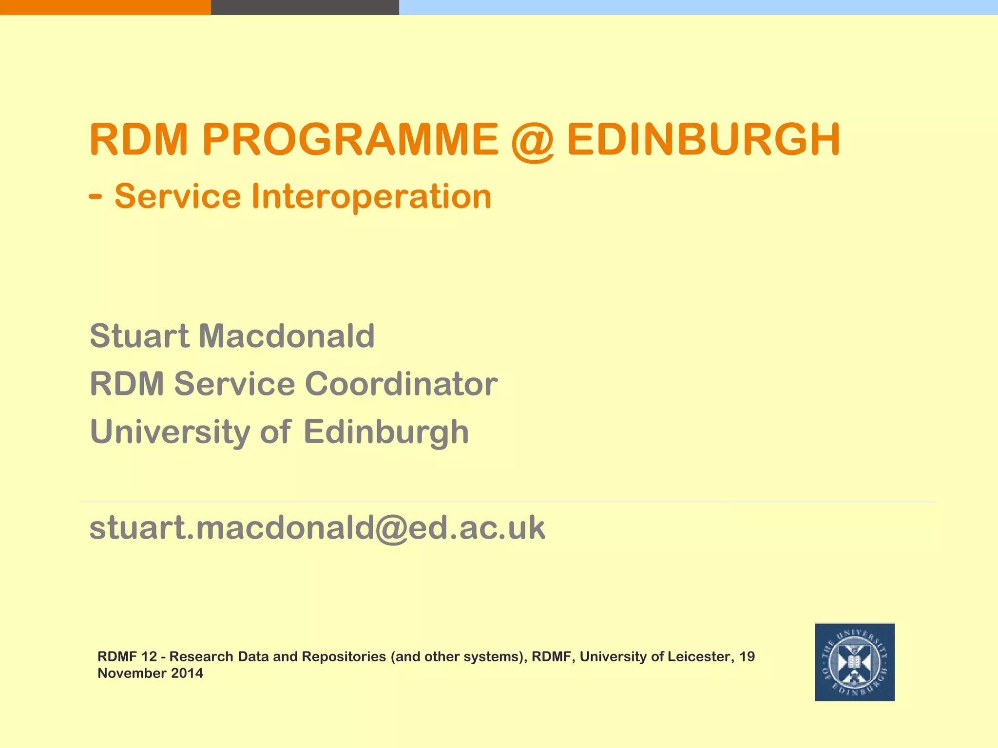 The document outlines the University of Edinburgh's Research Data Management (RDM) strategy, including its policies, services, and infrastructure for managing research data. It details systems such as Datastore for active data storage, Datashare for data publication, and Datavault for long-term storage, along with training and support for researchers. Additionally, it discusses the integration of the RSpace electronic lab notebook with these systems to enhance data management and accessibility.