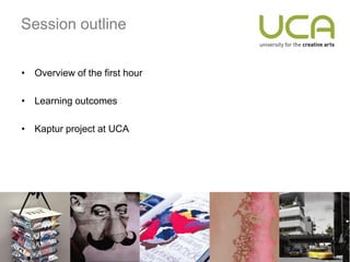 The document outlines a training session on research data management principles, focusing on the importance of curation and preservation of research data in the visual arts. It covers definitions, the data lifecycle, ethical considerations, and expected learning outcomes for participants. Key resources and further reading are also provided to enhance understanding of the subject.