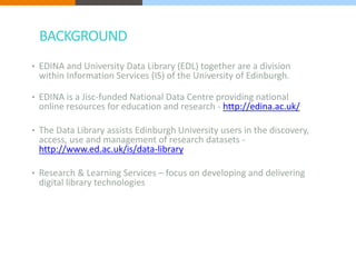 The document provides background information on RDM services at the University of Edinburgh. It summarizes that EDINA and the University Data Library provide research data management support and online resources. It then overviews key RDM services including DataStore for active research data storage, DataShare for open data publication, and plans for a long-term DataVault archive. The document also discusses RDM training and the university's RDM policy implemented through a multi-phase roadmap.