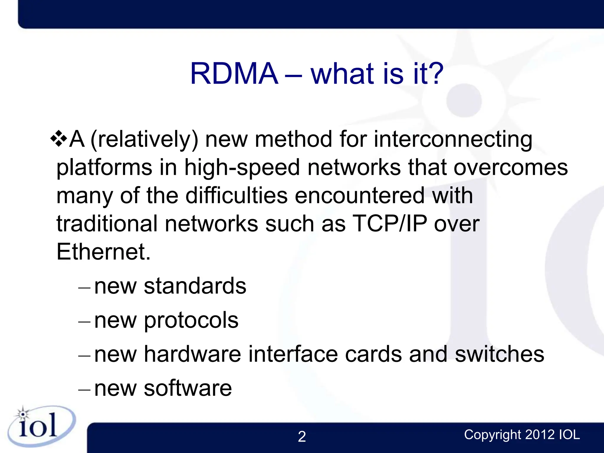 This document provides an introduction and overview of Remote Direct Memory Access (RDMA) programming. It describes what RDMA is, the benefits it provides over traditional TCP/IP networking, common RDMA technologies like InfiniBand and RoCE, the software drivers and libraries used, and how data is transferred asynchronously without operating system involvement through the use of channels, queues and memory registration. The document also compares the client/server models and data transfer processes of RDMA and TCP/IP.