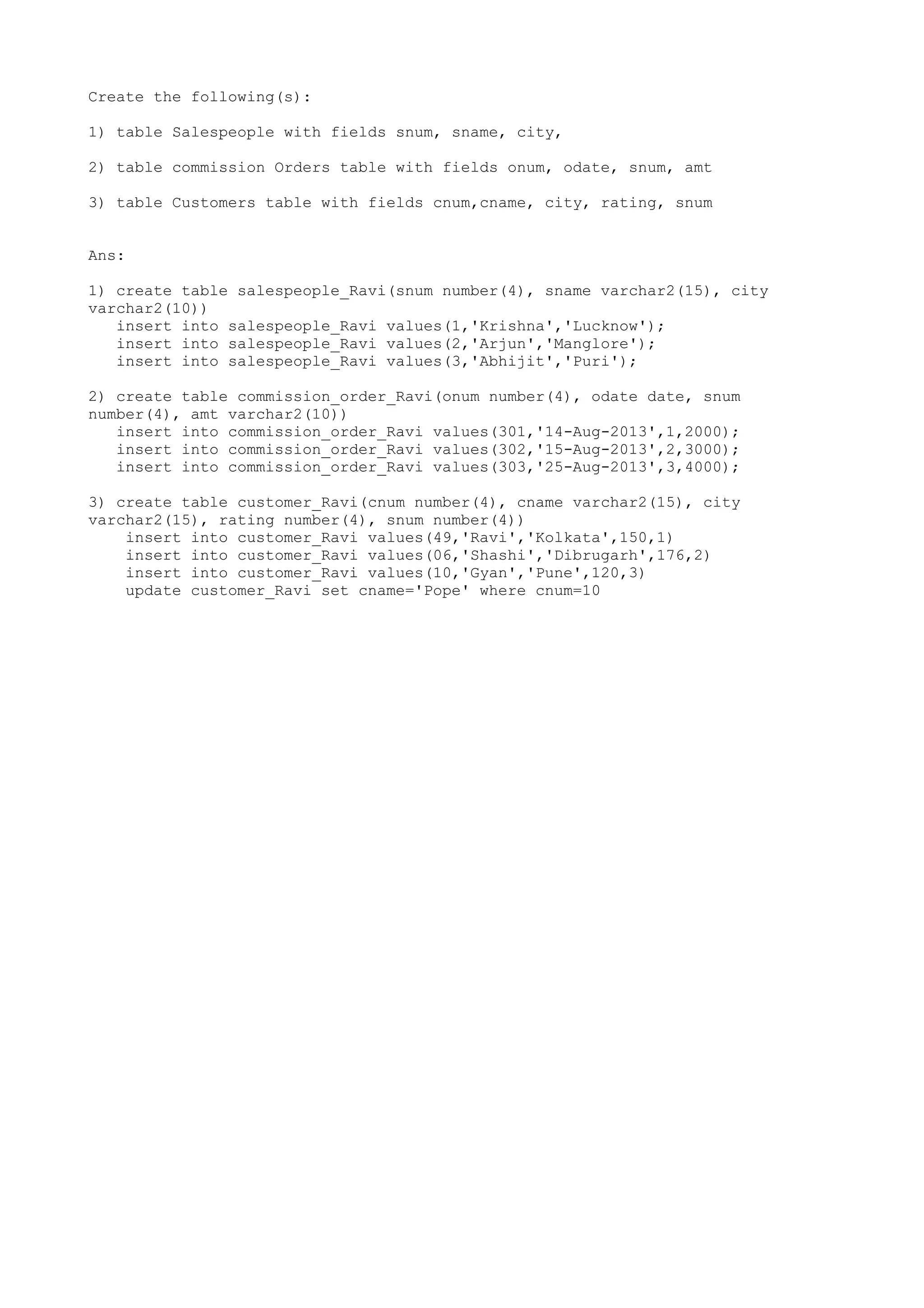 The document provides SQL commands to create three database tables: a salespeople table with fields for salesperson number, name, and city; an orders table with fields for order number, date, salesperson number, and amount; and a customers table with fields for customer number, name, city, rating, and salesperson number. Sample data is inserted into each table.