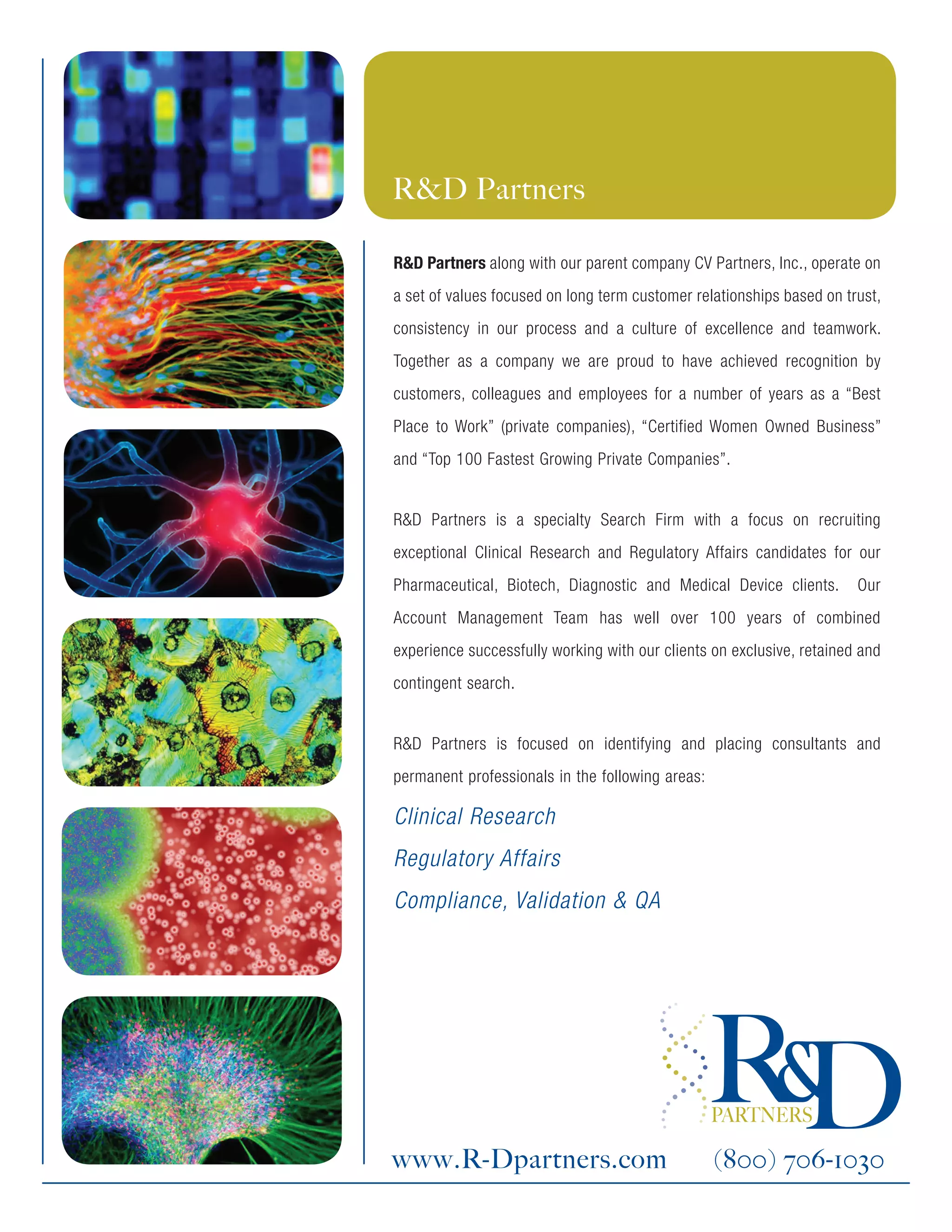 R&D Partners is a specialty search firm that recruits clinical research and regulatory affairs candidates for pharmaceutical, biotech, diagnostic, and medical device clients. They focus on project management, trial management, monitoring, data management, medical writing, and regulatory affairs positions. R&D Partners prioritizes long-term client relationships based on trust, consistency, and excellence. They have a team of experienced account managers and recruit consultants and permanent hires in areas like clinical research, regulatory affairs, validation, compliance, and quality.