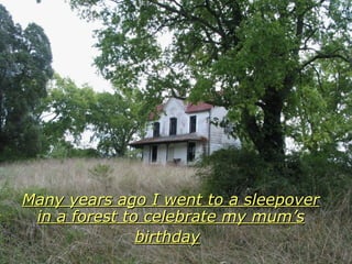 Many years ago, the author went to a forest sleepover to celebrate her mother's birthday. At night, she heard strange noises and saw a ghostly figure of a child at the window. Though scared, she didn't want to ruin the birthday celebration. After a few days of nightmares, she left, believing the figure was the soul of her dead sister wanting to be near their mother on her special day. Now, she sometimes hears a voice but feels it's her sister's, so she's not alone.