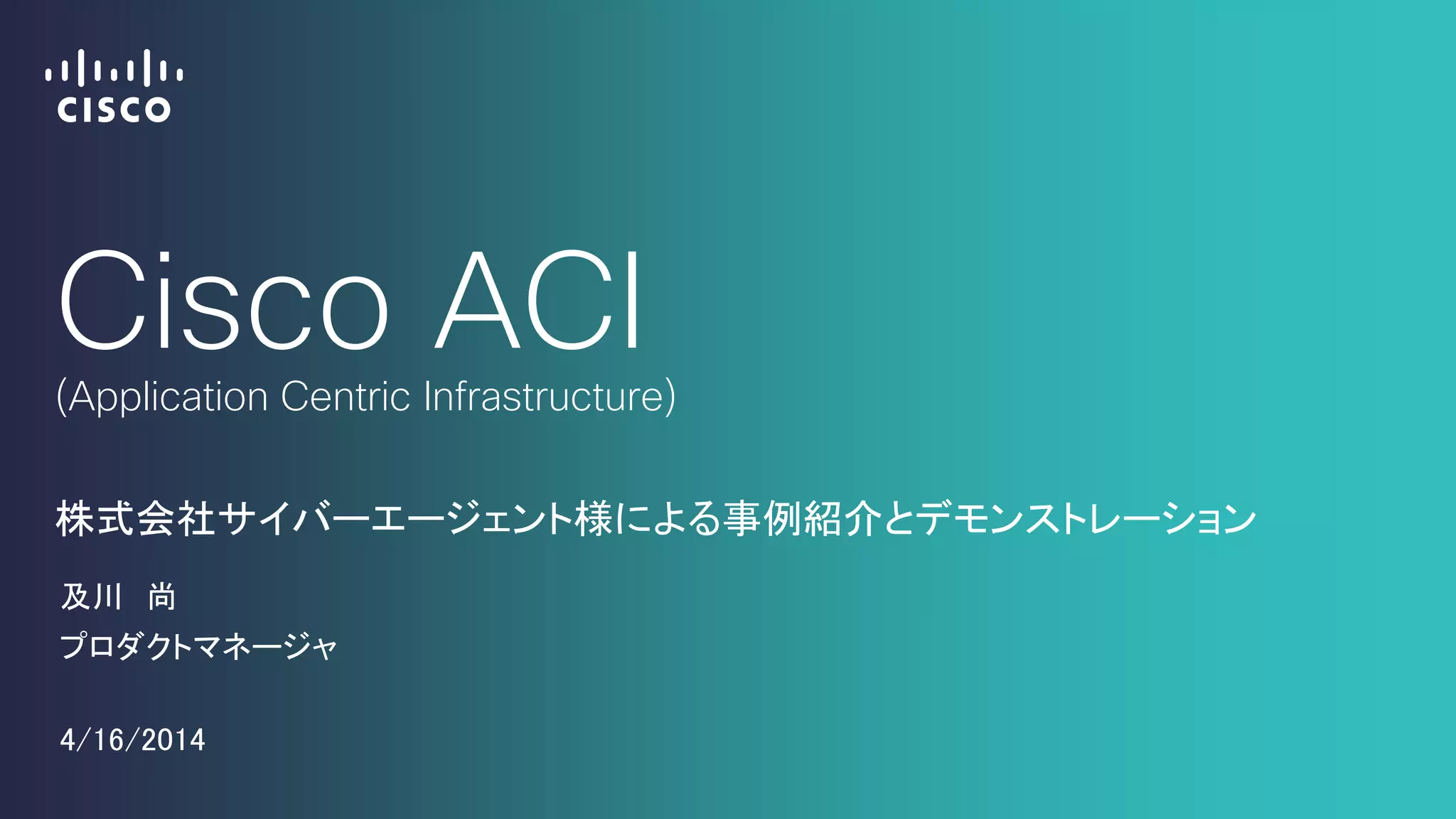 【Cisco Data Center Forum 2014】 Cisco ACI (Application Centric Infrastructure) – 株式会社サイバーエージェント様による事例紹介とデモンストレーション by シスコシステムズ合同会社 データセンタバーチャライゼーション事業 データセンタスイッチング プロダクトマネージャ 及川 尚