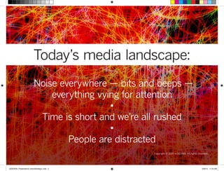 The document discusses how visual content is increasingly important for marketing and communication online. It emphasizes that a strong visual strategy, driven by brand vision and identity, can boost engagement on social media. Creating branded visuals like photos, videos, and illustrations that are sized for different platforms and tell the brand story can humanize a business. When paired with a sound branding strategy, a visual content plan can dramatically improve online results by stimulating sharing and driving behaviors.