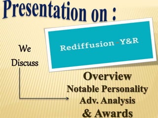 Rediffusion-Y&R is an Indian advertising agency founded in 1973 in Mumbai by three stalwarts: Diwan Arun Nanda, Ajit Balakrishnan, and Mohammed Khan. It is part of the global Young & Rubicam network with over 6,500 employees worldwide. Notable campaigns by Rediffusion-Y&R include ones for brands like Hamdard, Eveready, and Magnetic Maharashtra, the latter conceived to promote Maharashtra as a leading investment destination in India.
