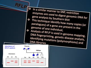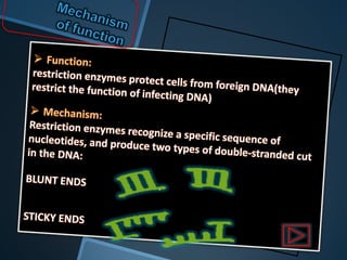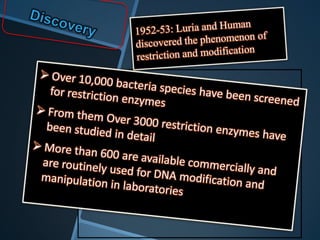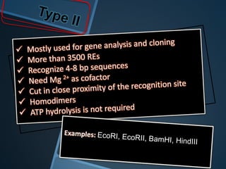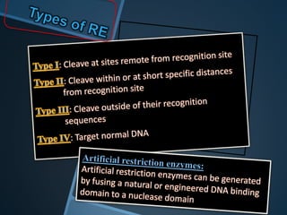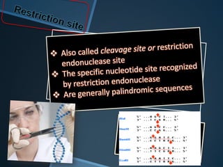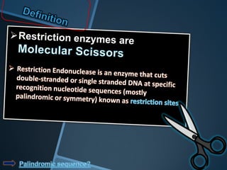 Restriction enzymes are enzymes that cut DNA at specific recognition sequences. There are three main types of restriction enzymes - Type I, II, and III. Type II restriction enzymes are the most commonly used in molecular cloning and DNA manipulation. They recognize short palindromic DNA sequences of 4-8 base pairs and cleave DNA within or nearby these recognition sites. Restriction enzymes have many applications including DNA sequencing, DNA libraries, and recombinant DNA techniques which enable genetic engineering.