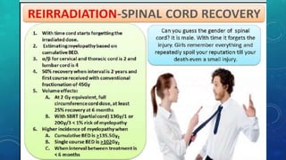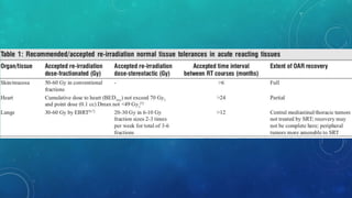 - Early-responding tissues like skin generally recover better than late-responding tissues like fibrosis and can tolerate reirradiation with reduced doses. Spinal cord and lung data from rodent and monkey studies show some reirradiation is possible. Kidney and bladder do not recover from late damage.