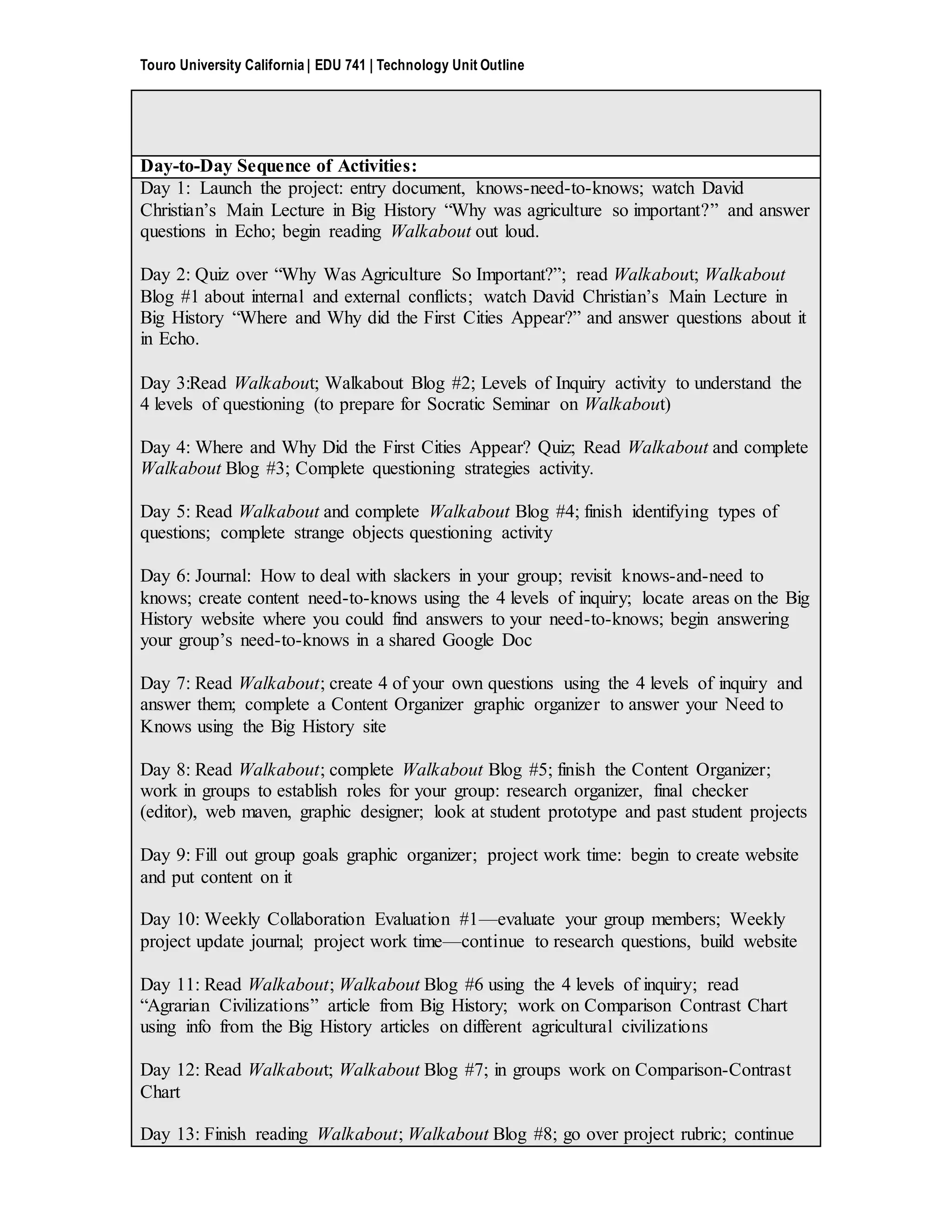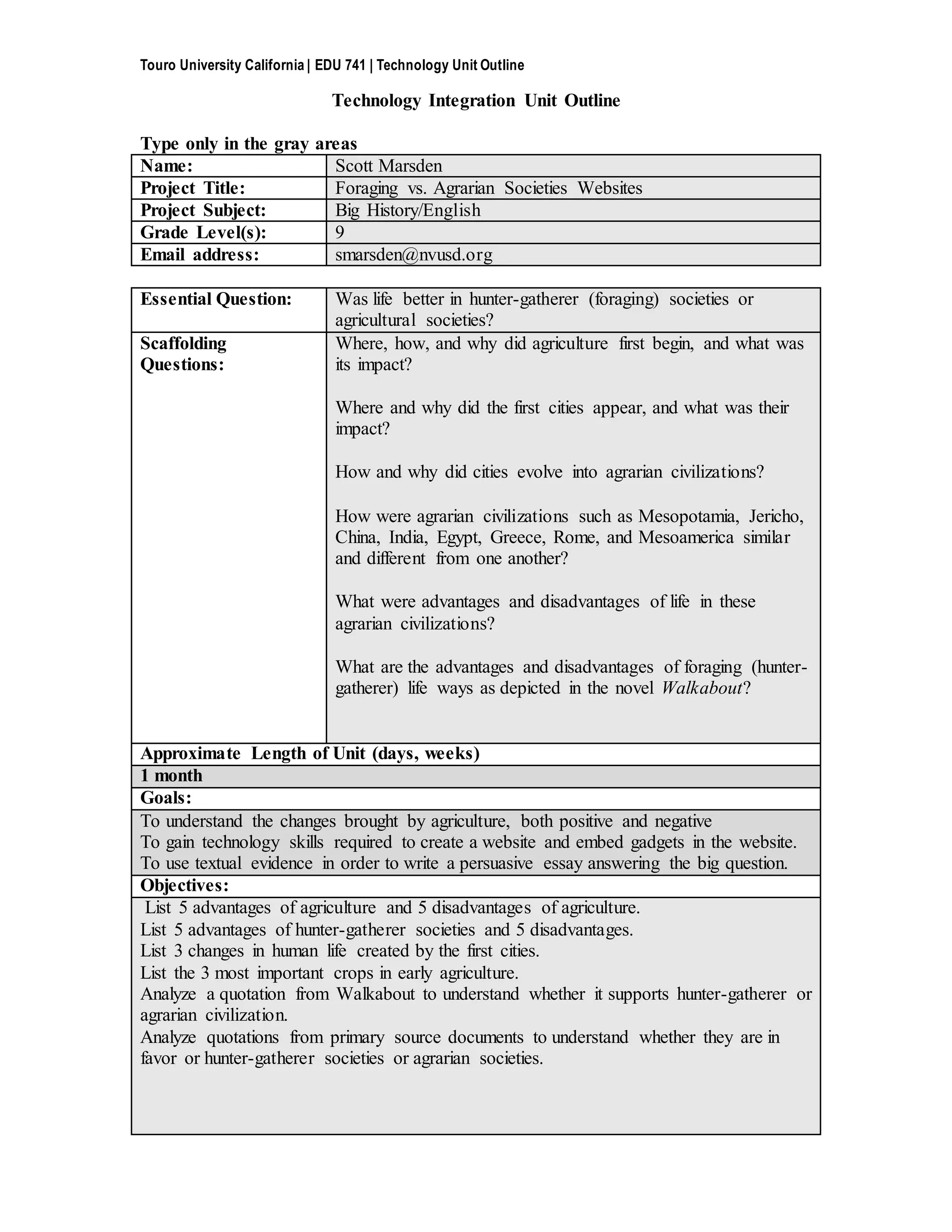 This document outlines a 1-month unit plan for a 9th grade Big History/English class comparing foraging and agrarian societies. Students will read Walkabout and use the Big History Project website to research and create websites answering whether life was better in foraging or agrarian societies. Over 20 days, students will read, discuss, research, collaborate in groups, and build websites presenting their findings. Differentiation is provided through pairing and challenging gifted students. References include the Big History Project, Walkabout, YouTube tutorials, and research databases.