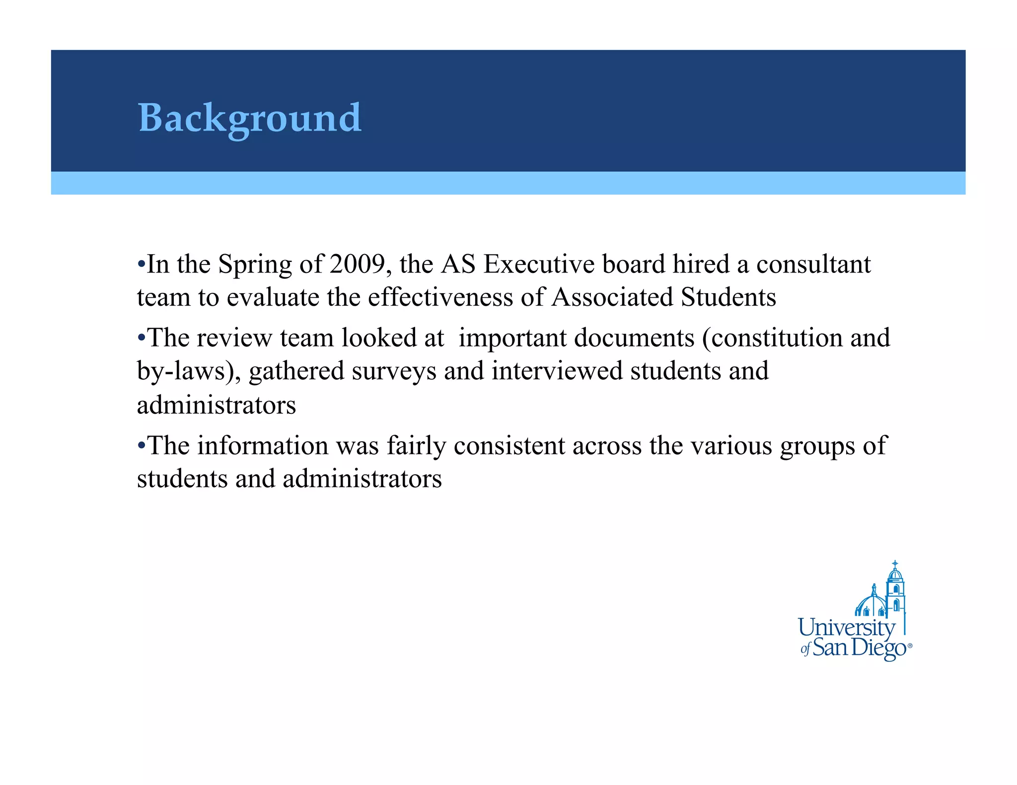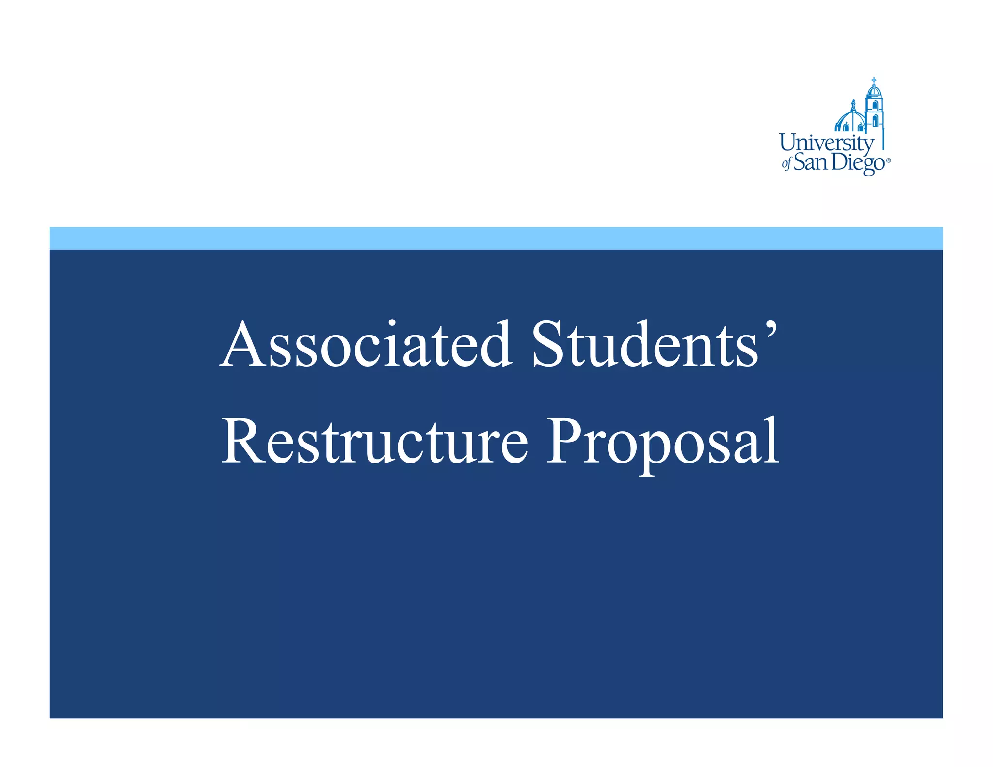 The document proposes restructuring Associated Students at USD based on a review that found it focuses too much on programming and has an ineffective Senate structure. It recommends separating AS into executive, legislative, and programming branches for better advocacy, representation, and specialized large events. Key changes include reducing AS positions, creating a 30-person student Senate based on residency and college, and establishing an independent Program Board to plan events. An implementation process and timeline is outlined subject to student approval votes.