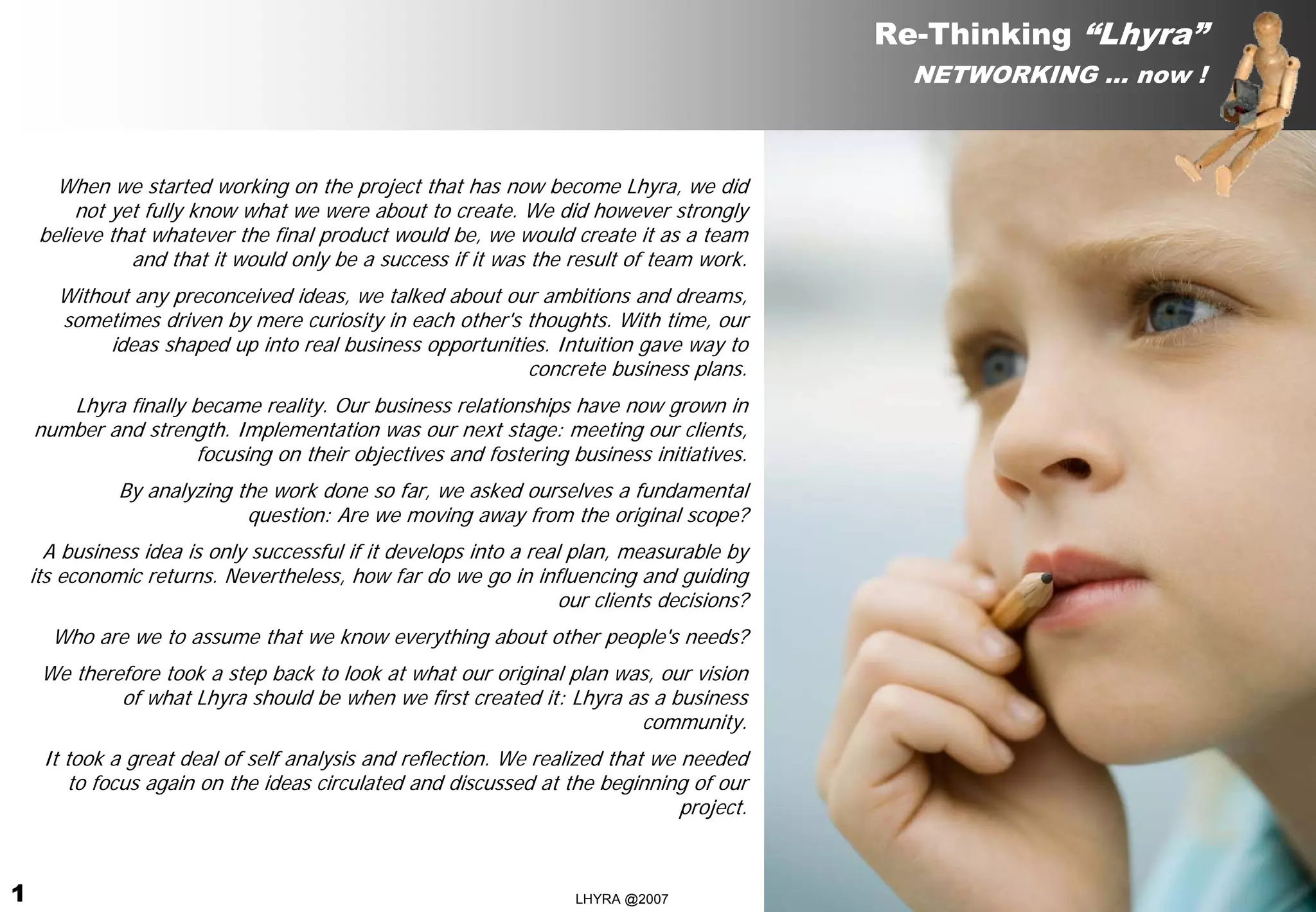 The document discusses rethinking the vision for "Lhyra" and focuses on social networks. It defines social networks as the interactions between elements in a social environment. It also identifies three types of networks: operational networks that help with routine tasks, personal networks that aid personal development, and strategic networks that help identify business opportunities. The document concludes that effectively managing networks allows one to control unforeseen events and invest in the future by responding to changes and turning them to one's advantage.