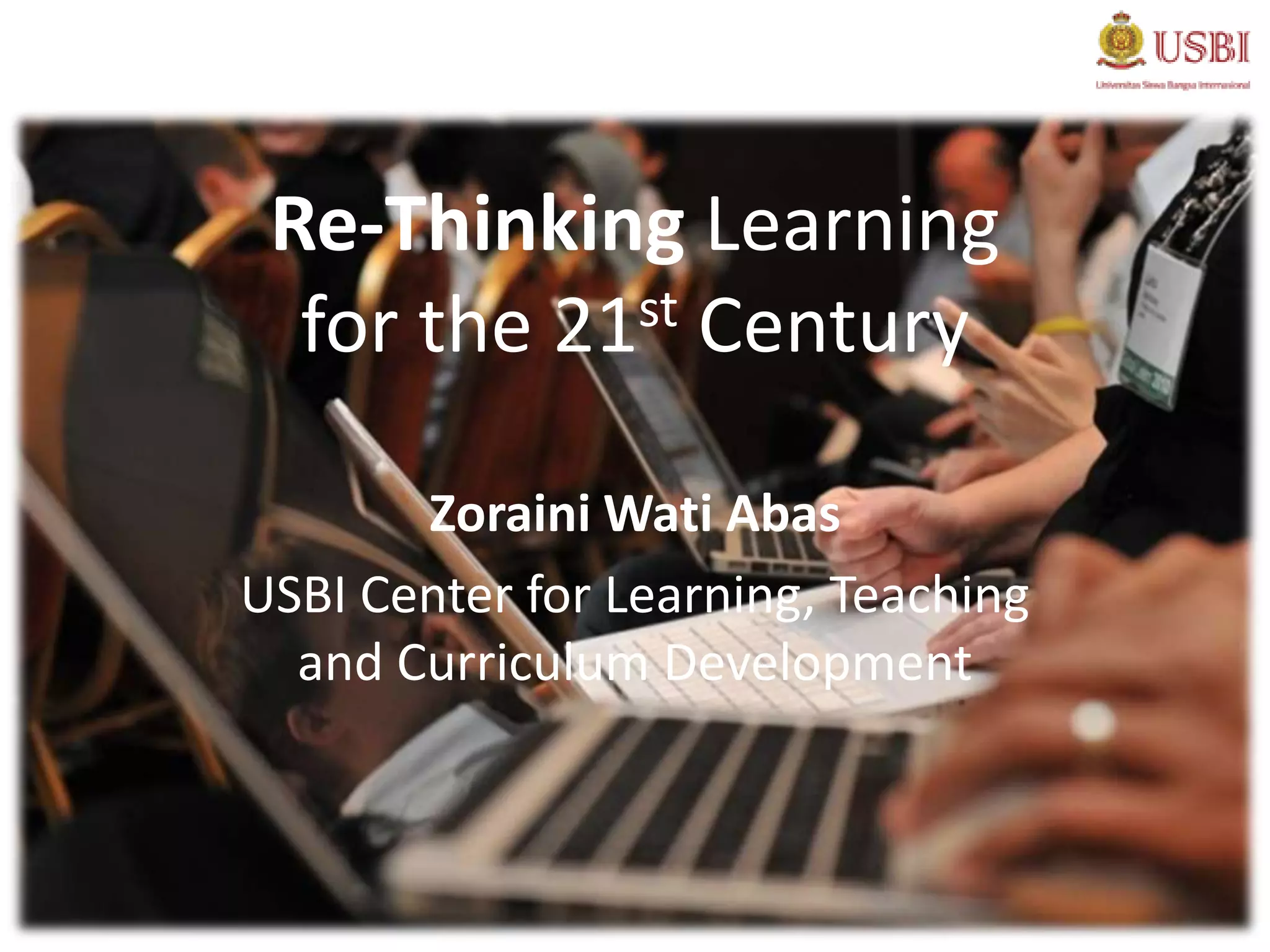 The document discusses re-thinking learning for the 21st century. It outlines how technology and ICT developments have transformed learning over the past century. These include the evolution from film and television to today's personalized mobile devices and cloud computing. The document also discusses how 21st century learners and skills have changed, requiring new approaches like collaborative and creative learning. Emerging tools and trends in online and mobile learning are presented, as well as frameworks for 21st century learning.