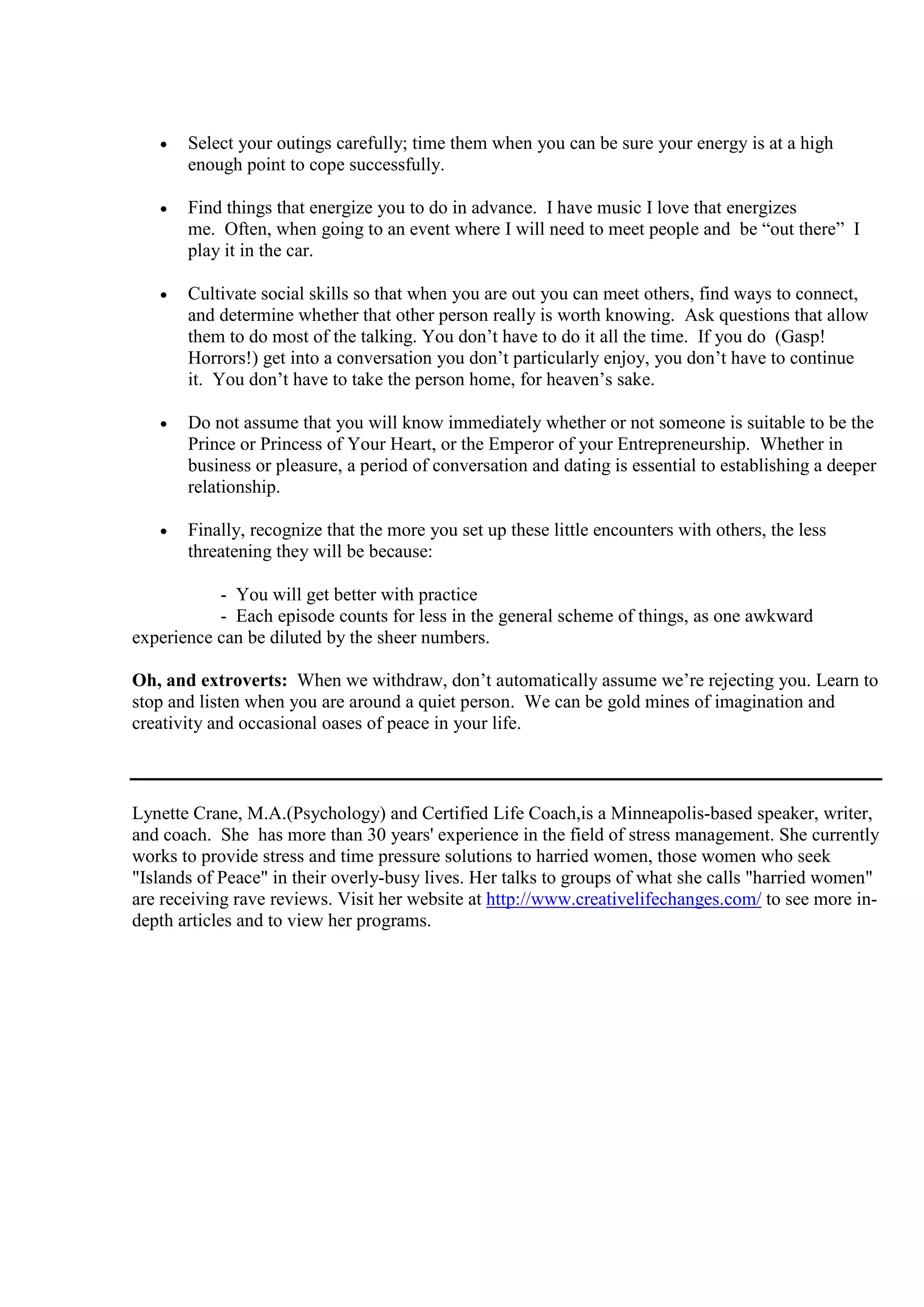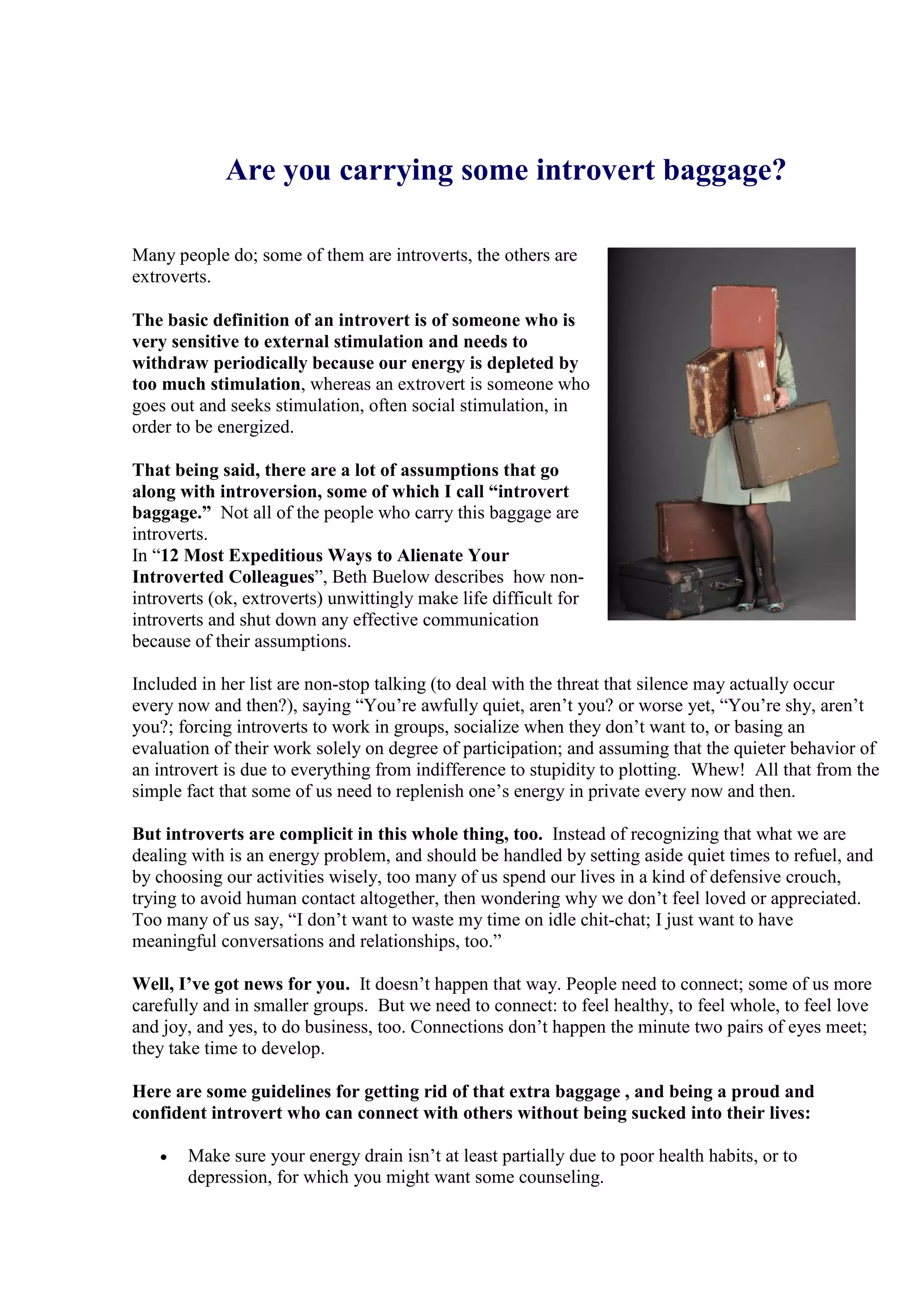 The document discusses the concept of 'introvert baggage,' which involves misconceptions about introverts and how extroverts can unintentionally alienate them. It emphasizes the importance of social connections for introverts while encouraging them to engage meaningfully without completely withdrawing from social interactions. The author provides guidelines for introverts to manage their energy levels and develop social skills to better connect with others.