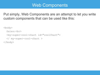 The document discusses web components, a technology aimed at creating reusable custom elements in web development, primarily using the Polymer library. It describes the key concepts of web components, including templates, shadow DOM, HTML imports, and custom elements, while emphasizing their current state of development and challenges with browser compatibility. The author advocates for the potential impact of web components on future web applications and encourages exploration of available polyfills and resources.