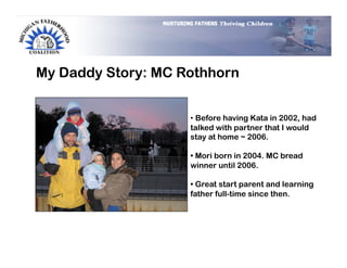 This document summarizes a presentation given by two stay-at-home dads, Chris Singer and MC Rothhorn, about how to better engage fathers in early childhood programs. They discuss common obstacles that discourage dad participation like work obligations and a lack of knowledge. The presentation provides tips for making programs more dad-friendly through activities, marketing, and partnering with other organizations. It also outlines current efforts like partnering with an expectant parent organization to facilitate dad-focused birthing classes.