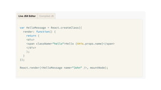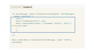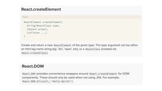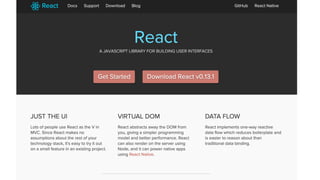 The document describes React, a JavaScript library for building user interfaces. It introduces some key concepts of React including components, props, state, and the virtual DOM. Components are the building blocks of React apps and can be composed together. Props provide immutable data to components, while state provides mutable data. The virtual DOM allows React to efficiently update the real DOM by only changing what needs to be changed. Data flows unidirectionally in React from parent to child components via props, and state updates within a component are handled via setState().