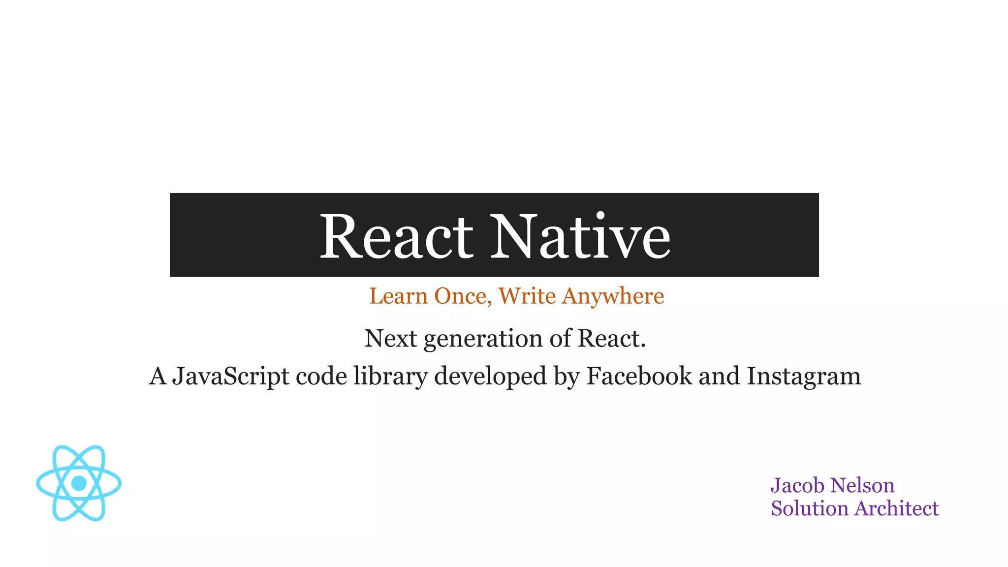 Next generation of React is a JavaScript code library developed by Facebook and Instagram called React Native. It allows developers to write once and deploy their code to both Android and iOS platforms, providing native experiences on each. Some key advantages include being open source and free to use, providing a single code base for both platforms, and enabling hot reloading and over-the-air app updates.