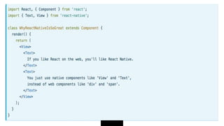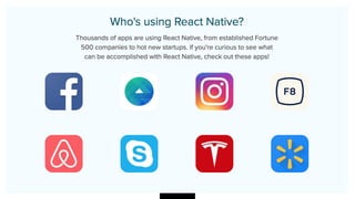 This document provides an overview of ReactJS and React Native. It defines ReactJS as a JavaScript library for building user interfaces and explains concepts like components, virtual DOM, JSX, props, states, and one-way data flow. It also covers React Native and how it allows building native mobile apps using JavaScript and React. Key differences between Ionic and React Native are outlined. Examples of companies that use ReactJS and React Native are given. Setup and installation instructions for React Native are provided.