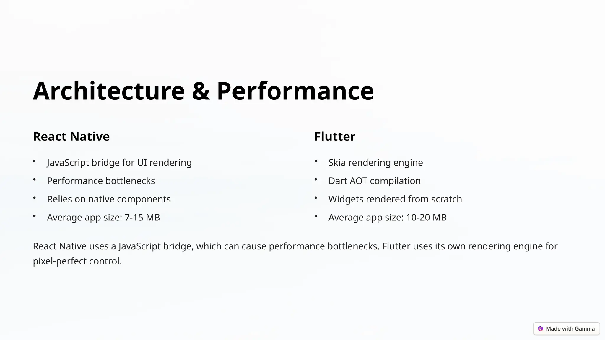 React Native uses a JavaScript bridge, which can cause performance bottlenecks. Flutter uses its own rendering engine for