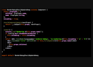 React performance best practices include using the react-addons-perf module to measure wasted renders, avoiding direct state/prop mutations, ensuring connected components only re-render when needed, and using immutability to prevent unnecessary re-renders when data changes. Potential issues are components re-rendering even when props haven't changed, large portions of the tree re-rendering unnecessarily, and binding functions incorrectly.