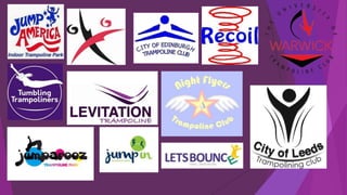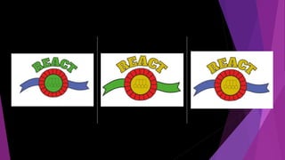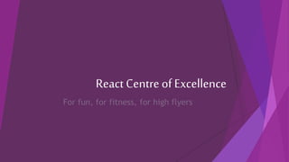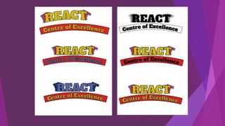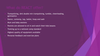 The document provides information about React Centre of Excellence, a trampolining and gymnastics club. It discusses React's offerings such as trampolining, tumbling, dance, and gymnastics classes for various ages. It also notes they have high quality equipment and individualized attention. The target audience is primarily children ages 3-12, with parents as a secondary audience. Various logos from other clubs are analyzed, with notes on effective and ineffective design elements. Ideas are generated for how the new React logo could be represented on uniforms, water bottles, posters, and more. Color palettes and potential mascot ideas incorporating an apple are discussed. Initial logo drafts with a bold font inside a box are