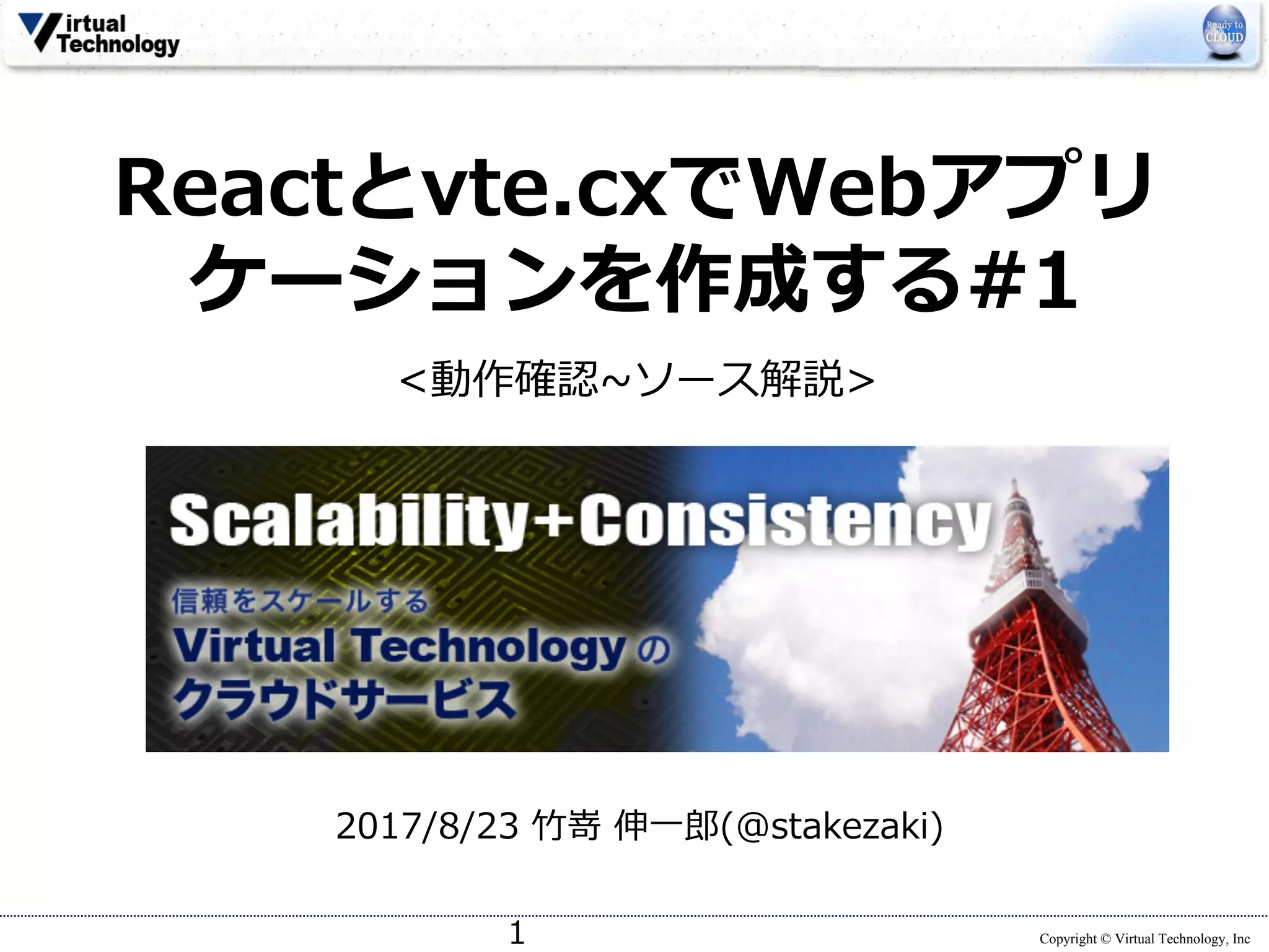 Technology, Inc Reactとvte.cxでWebアプリ ケーションを作成する#1 2017/8/23 ⽵嵜 伸⼀郎(@stakezaki) 1 <動作確認~ソース解説>