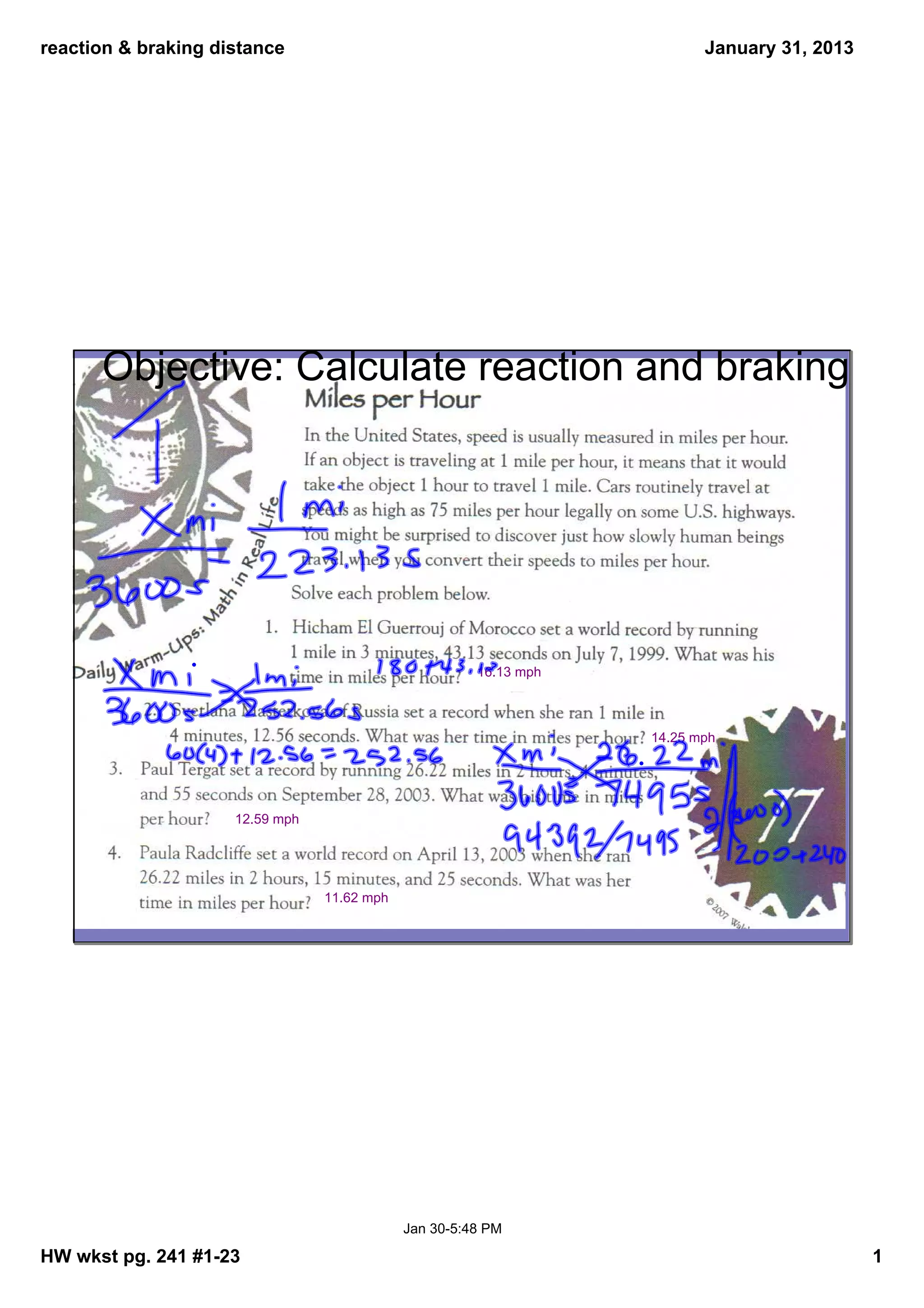 This document discusses reaction distance and braking distance when driving. It provides formulas to calculate both. For reaction distance, it is estimated as d = 1.1 x r, where d is distance in feet and r is speed in mph. For braking distance, it is estimated as b = (r/30) x F, where b is braking distance in feet, r is speed in mph, and F is a driving surface factor table provided. It then gives an example calculation for estimating reaction and braking distance for a driver going 50 mph on dry asphalt.