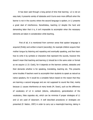 This reaction paper discusses challenges in teaching a second language (L2) and strategies to address those challenges. It notes that a learner's first language (L1) can negatively interfere with L2 learning through differences in vocabulary, grammar, and other linguistic elements. However, the paper advocates properly utilizing L1 in the classroom and focusing initially on developing students' spoken language skills over written skills. The author reflects on applying strategies from theorists like Paul Nation, such as varying task difficulty and goals, to improve L2 teaching practices and help students engage more with the language.