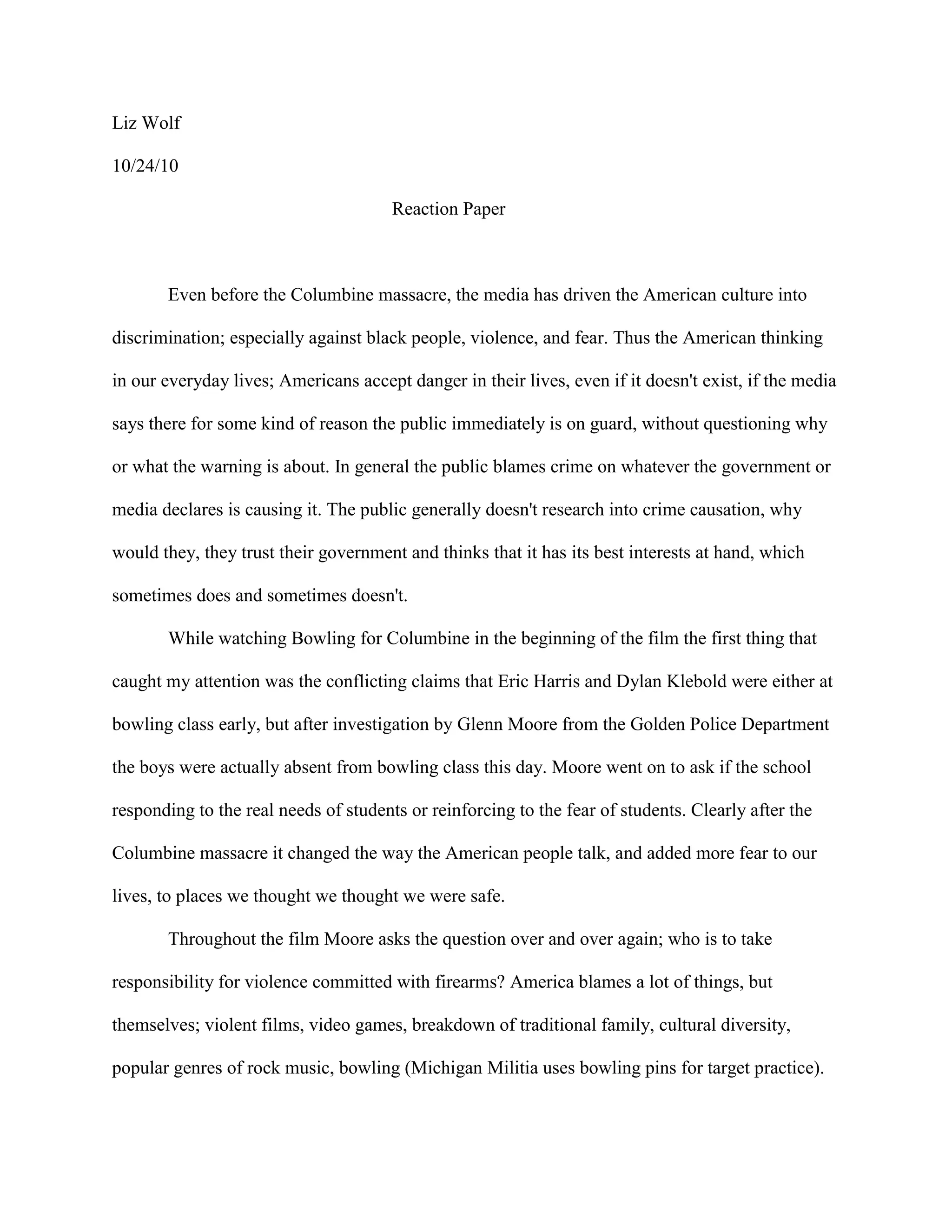 The document discusses the documentary Bowling for Columbine and its examination of the causes of gun violence in America. It explores how the media drives fear and discrimination in American culture. The film questions who is responsible for gun violence and concludes it is not due to gun ownership but the exploitation of violence through the media and government. Fear is intensified by the media and controlled by the government to manipulate society. While gun ownership is a constitutional right, gun control policy remains controversial as it debates this right versus preventing crime.