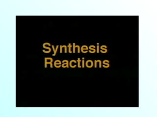 The document discusses chemical reactions and the four main types: synthesis, decomposition, single replacement, and double replacement. It defines key terms like reactants and products. Synthesis reactions combine two elements to form a compound. Decomposition reactions involve a single reactant breaking down into simpler products. Single replacement reactions involve one element replacing another in a compound. Double replacement reactions swap ions between two compounds. The law of conservation of mass is also mentioned.