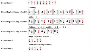 The document presents an overview of reactive programming and Spring WebFlux, focusing on its non-blocking architecture designed to handle high client demand. It covers concepts such as reactive systems, project reactor, and key features of Spring WebFlux, alongside code examples for implementing a reactive card magic application. Resources for further reading and related projects are also provided.