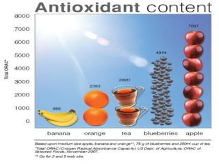 3. It also outlines the body's natural antioxidant protection systems including enzymes like superoxide dismutase and catalase, as well as dietary and plant-derived antioxidants. When antioxidant levels are insufficient to deal with ROS, oxidative stress can lead to diseases.