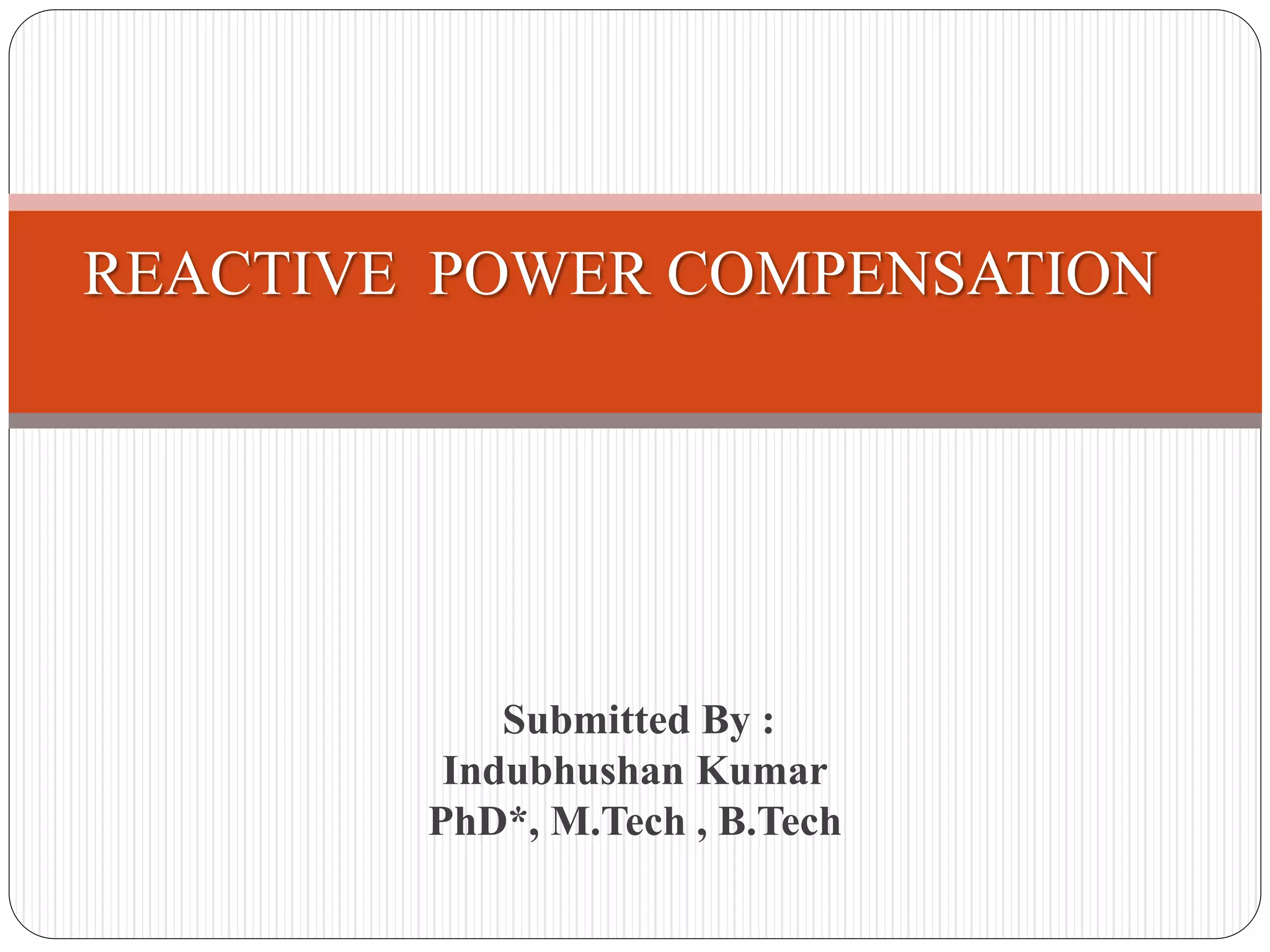 Reactive power compensation is used to improve the performance of AC power systems. There are various methods of reactive power compensation including shunt compensation, series compensation, static VAR compensators, and static synchronous compensators. Shunt compensation devices such as capacitors and reactors are connected in parallel to transmission lines to regulate voltage. Series compensation uses capacitors connected in series to transmission lines to increase power transfer capability. Static VAR compensators and static synchronous compensators use thyristor-based voltage sourced converters to dynamically inject or absorb reactive power and control voltage. Reactive power compensation provides benefits such as improved power factor, voltage regulation, reduced losses, and increased power transfer capacity.