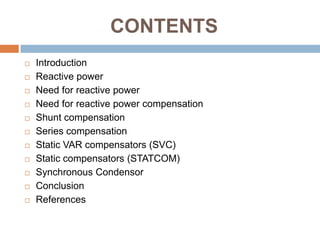 This document presents an overview of reactive power compensation. It defines reactive power compensation as managing reactive power to improve AC system performance. There are two main aspects: load compensation to increase power factor and voltage regulation, and voltage support to decrease voltage fluctuations. Several methods of reactive power compensation are discussed, including shunt compensation using capacitors and reactors, series compensation, static VAR compensators (SVCs), static compensators (STATCOMs), and synchronous condensers. SVC and STATCOM technologies are compared, with STATCOMs having advantages of smaller components, better control, and transient response.
