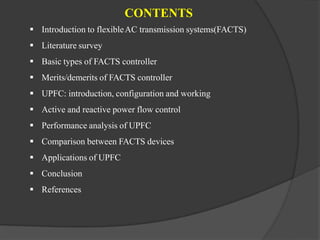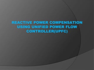 The document discusses reactive power compensation using a Unified Power Flow Controller (UPFC). It begins with an introduction to Flexible AC Transmission Systems (FACTS) and defines a UPFC. It then discusses literature on FACTS controllers, the basic types of FACTS controllers including series and shunt configurations, and the merits and demerits of FACTS devices. The document focuses on the UPFC, describing its introduction, configuration, working, and its ability to control active and reactive power flow. It analyzes and compares the performance and applications of the UPFC to other FACTS controllers.
