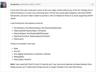 The document discusses Reactive Xamarin, which combines Rx (Reactive Extensions) and Xamarin. It introduces key Rx concepts like Observables, LINQ, and Schedulers. Observables represent asynchronous push-based collections and address concurrency using Schedulers. LINQ allows querying Observables. Reactive UI and RxLite provide UI frameworks that integrate these Rx concepts into Xamarin apps through bindings and commands. In summary, Reactive Xamarin leverages Rx to build responsive and concurrent Xamarin apps in a reactive and declarative manner.