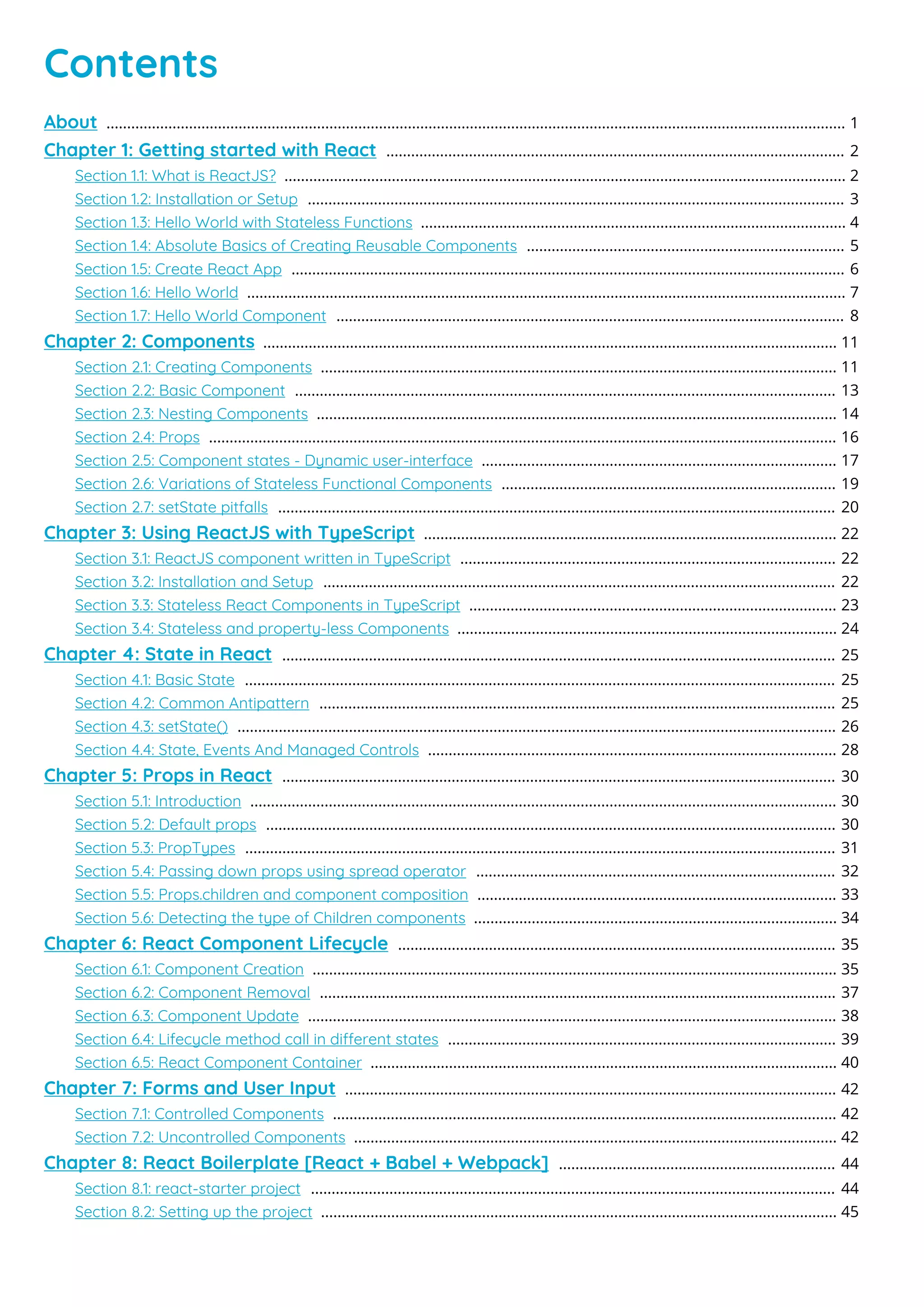 This document provides an overview of React JS and discusses topics such as getting started, components, props, state, lifecycles, forms and user input, routing, and communicating between components. It includes chapters on basic concepts, creating and nesting components, passing data between components via props, managing component state, the component lifecycle, and setting up a React environment with tools like Webpack and Babel. Sections dive deeper into specific aspects like controlled vs uncontrolled components, default props, prop types, and using React with other libraries like TypeScript and jQuery.