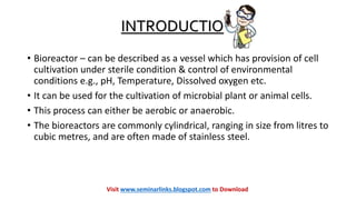 This document provides an overview of bioreactors. It begins by defining a bioreactor as a vessel that provides sterile conditions and environmental control for cell cultivation. It then describes the typical components of a bioreactor, including an agitator for mixing, a baffle to prevent vortex formation, a sparger for oxygen delivery, and a jacket for temperature control. Finally, it discusses various types of bioreactors such as continuous stirred tank, bubble column, airlift, packed bed, and photo bioreactors; and it notes that bioreactors are commonly used in food, beverage, and pharmaceutical industries.