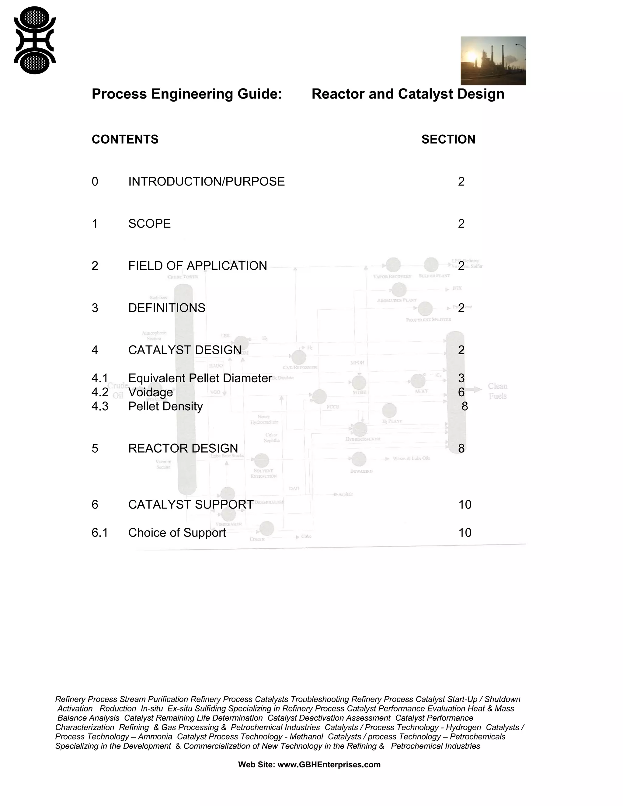 The document is a comprehensive process engineering guide by GBH Enterprises, focusing on reactor and catalyst design specifically for refining and petrochemical industries. It addresses key parameters such as catalyst size, shape, voidage, and density and provides essential equations for optimizing catalyst performance and reactor geometry. Additionally, it outlines various catalyst support types and design considerations, emphasizing the need for process engineers to evaluate these factors for efficient operations.