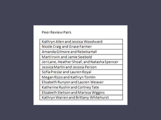 This document provides guidance and deadlines for students completing a literature review paper. It outlines the next steps which are to complete a peer review, revise the paper based on feedback, and meet with the writing center by March 30th. It then provides tips for the literature review section, referencing style, and organization of the paper. The document concludes by assigning students to peer review groups and having them discuss their paper revisions and questions.